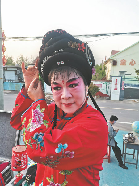 Wang Mu'er of the Wulian New Era Maoqiang Art Troupe prepares for a performance in Donghonghe village in Wulian county on May 14. [Photo provided to China Daily]