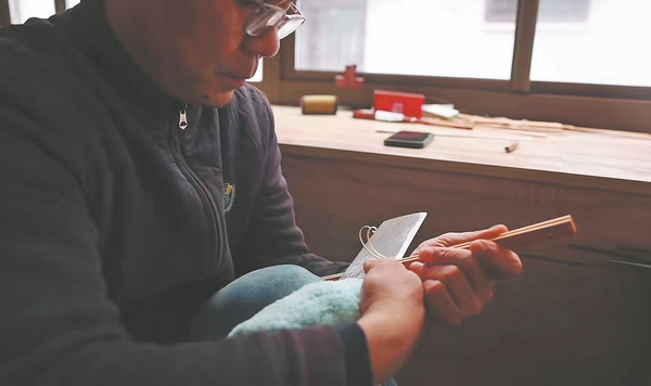 This is bamboo wax, and when scraped off, the green color underneath is revealed — thus it's known as "jade bamboo". The wax shields the plant from excessive moisture loss and pests, giving it a smooth, suave quality long admired by Chinese fan-makers including Xu and his father.